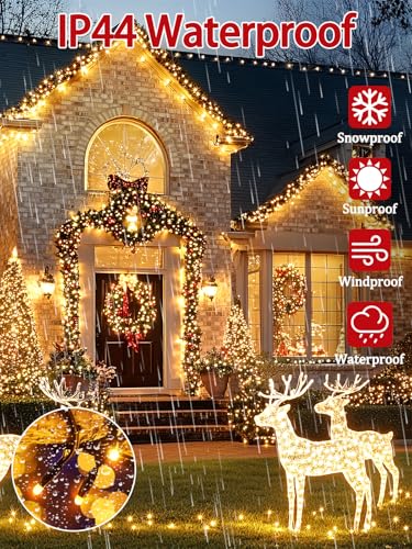 2025 New Upgraded Christmas Lights for Indoor/Outdoor: These 2-Pack 66FT 200 LED Christmas lights feature 200 warm white LEDs and offer a timer, memory, dimmable function, waterproof construction, and 13 lighting modes design. The fairy string lights emit a warm glow, creating the perfect unforgettable atmosphere for Christmas, weddings or any holiday decorations