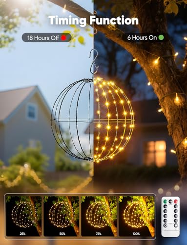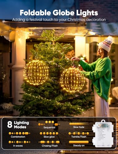 Outdoor Christmas Sphere Lights with 8 Lighting Modes: This set includes three 12-inch foldable globe lights, each featuring 120 warm white LEDs. These hanging sphere lights offer eight distinct lighting modes: combination, wave, sequential, slow glow, chasing/flash, slow fade, twinkle/flash, and steady on.