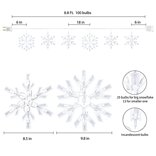 【 Christmas Icicle Lights with 6 Snowflake Drops 】- The snowflake Christmas string lights are 9 feet long with 6 drops of cute Snowflake-shaped bulbs that make an adorable addition to your porch or outdoor living space. 100 bright mini bulbs are included for 4 big snowflakes (9.5”) and 2 small snowflake (5.5”), each of which is roughly 18 inches wide.